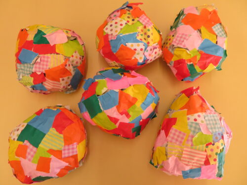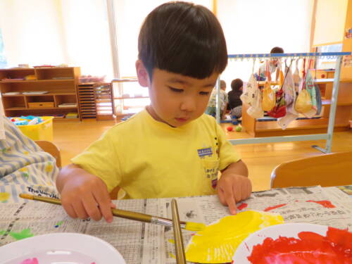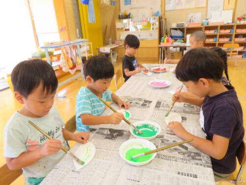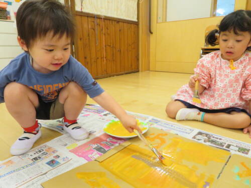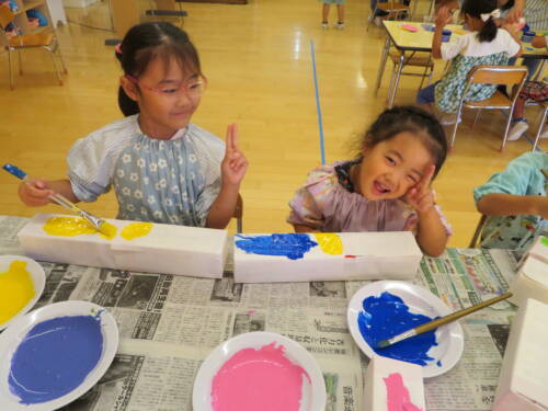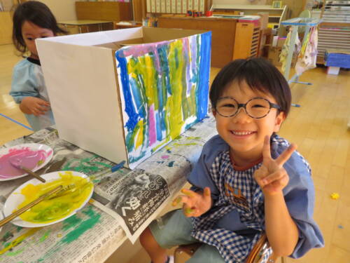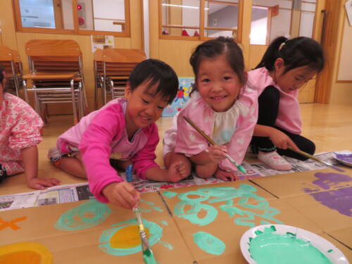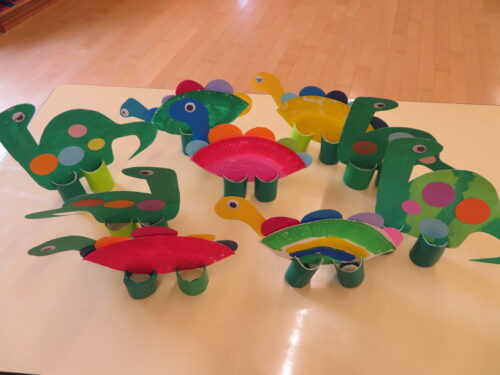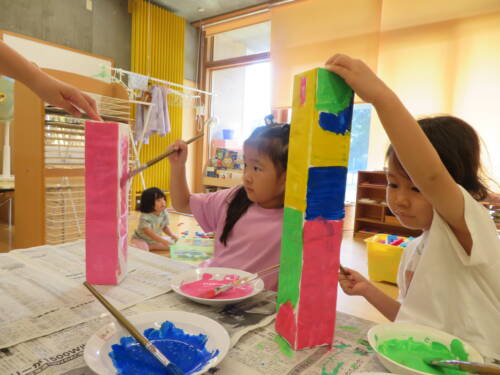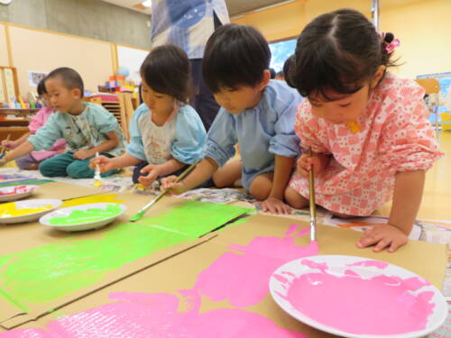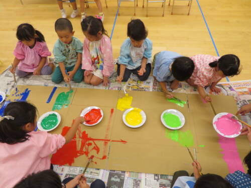 子どもたちの創造力、発想力がとても豊かで、沢山のアイディアを出し合いながら、品物や、ゲームが決まっていきましたよ!!ダイナミックに絵の具を使って、作り上げた大きな「ブラキオザウルス」は、カラフルで迫力満点です♡