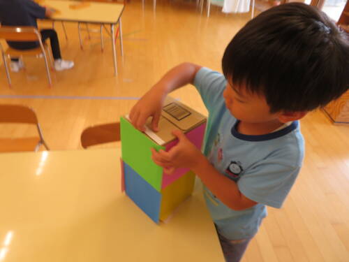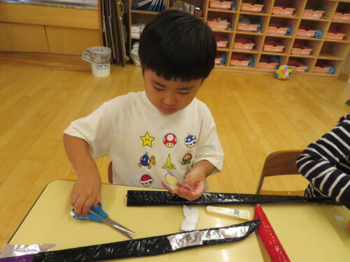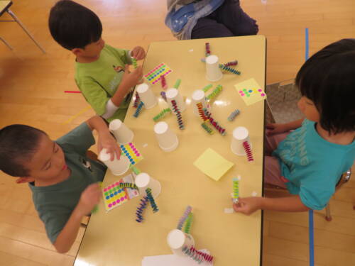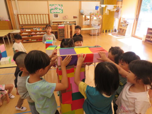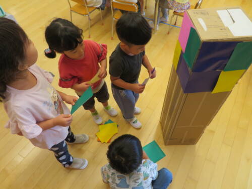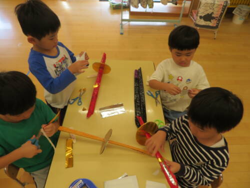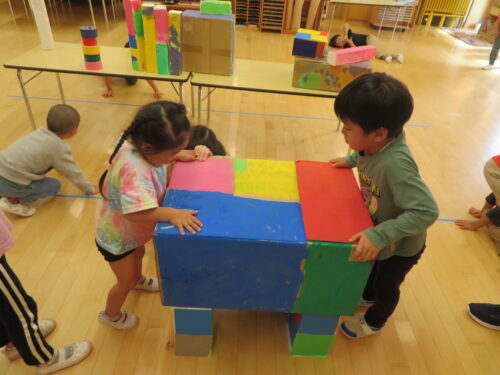 いよいよ大きなブラキオサウルスの組み立てです♪「顔はこっちの長い段ボールがいいと思う!」 「尻尾はうねうねにしよ~♪」と子ども達が話し合いながら組み立てましたよ☆