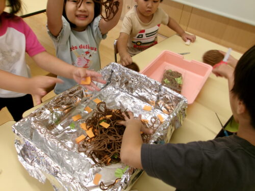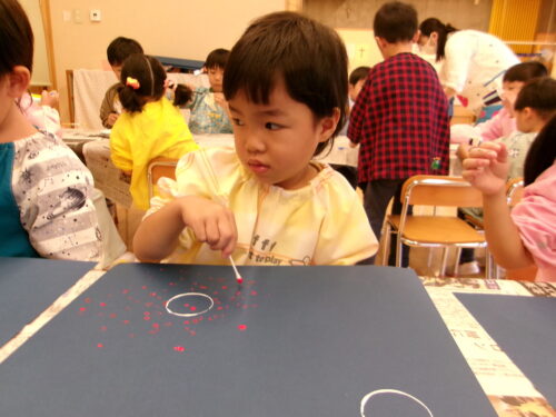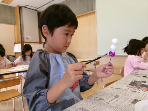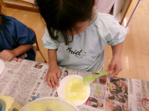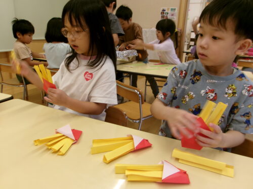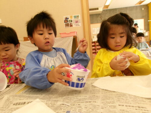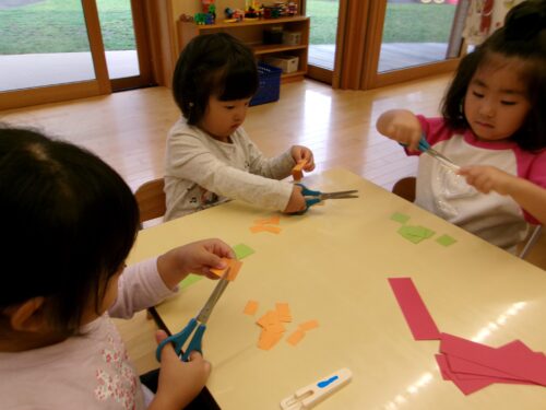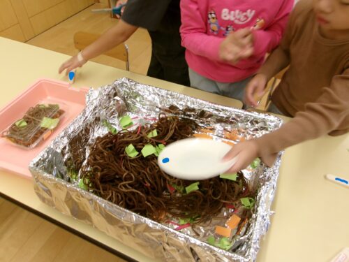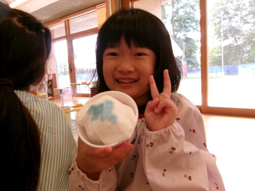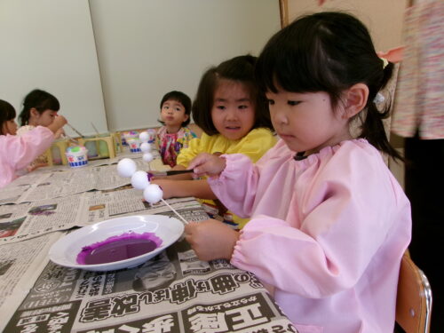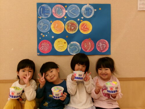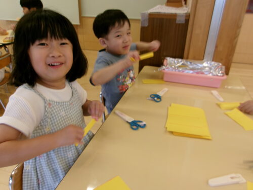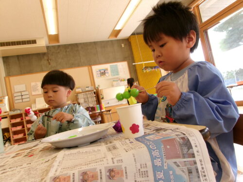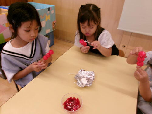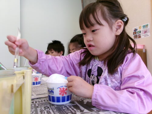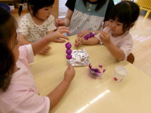 「かき氷がいいな♪」「この間行ったお祭りはやきそば売っていたよ!」「フルーツ飴作りたい~」と色々な提案をしてくれたにじ組さん。2学期が始まると早速製作に取り掛かりました。途中もこうしたらいいんじゃない?と年長さん中心に積極的に参加をしてくれました。年少さん年中さんも年上のお友だちに負けずに「これやりたい!!」と楽しく取り組んでくれましたよ!