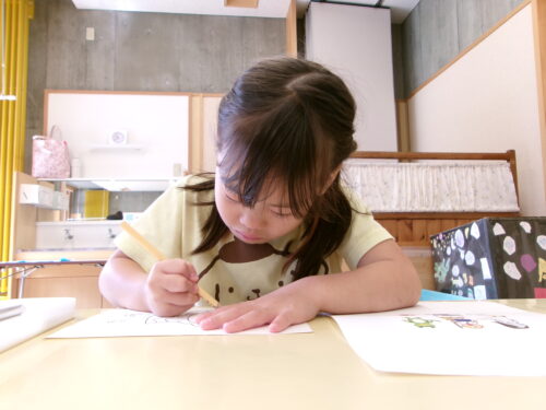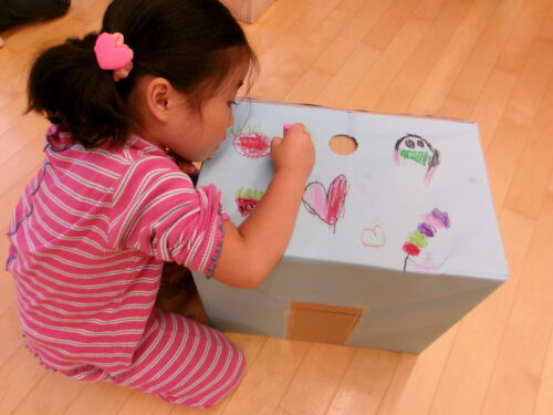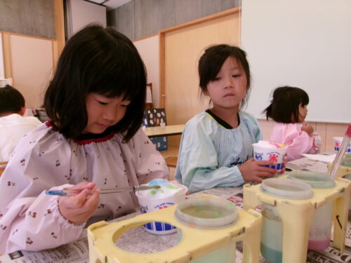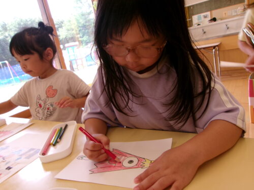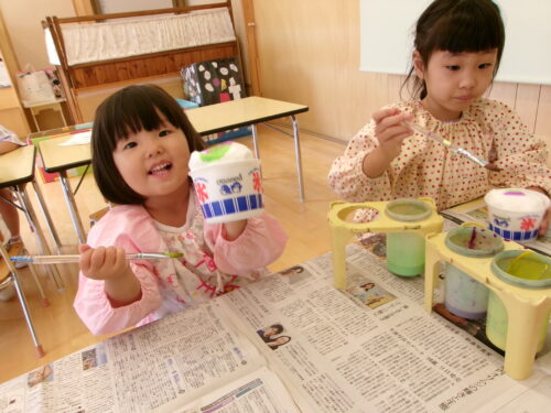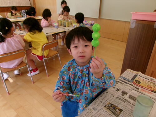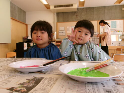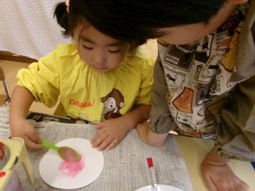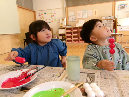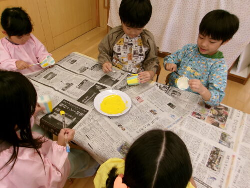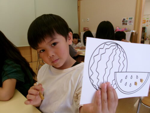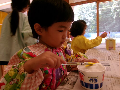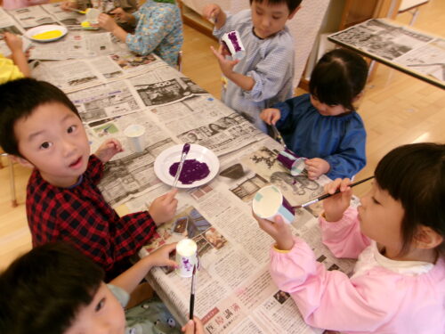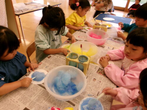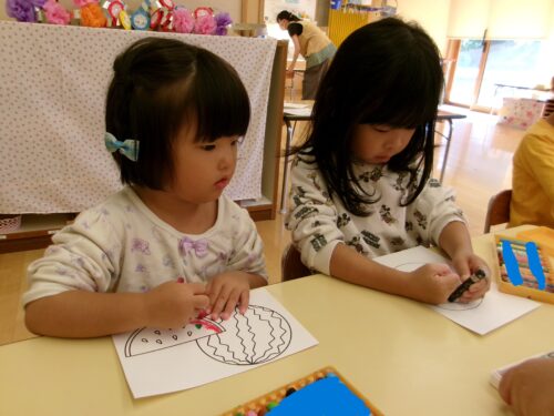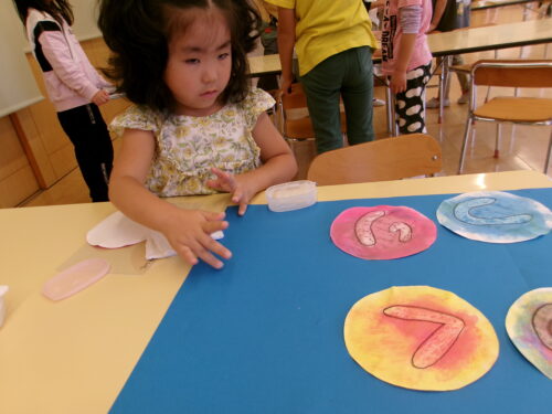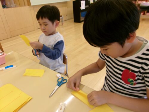 「かき氷がいいな♪」「この間行ったお祭りはやきそば売っていたよ!」「フルーツ飴作りたい~」と色々な提案をしてくれたにじ組さん。2学期が始まると早速製作に取り掛かりました。途中もこうしたらいいんじゃない?と年長さん中心に積極的に参加をしてくれました。年少さん年中さんも年上のお友だちに負けずに「これやりたい!!」と楽しく取り組んでくれましたよ!