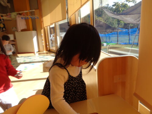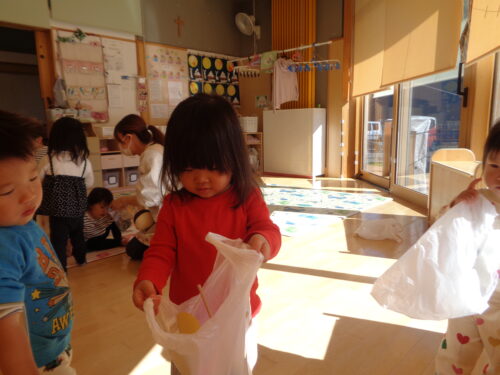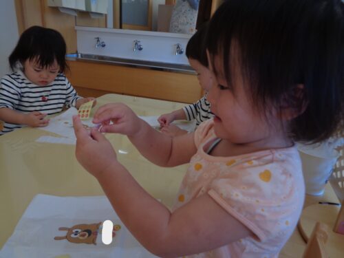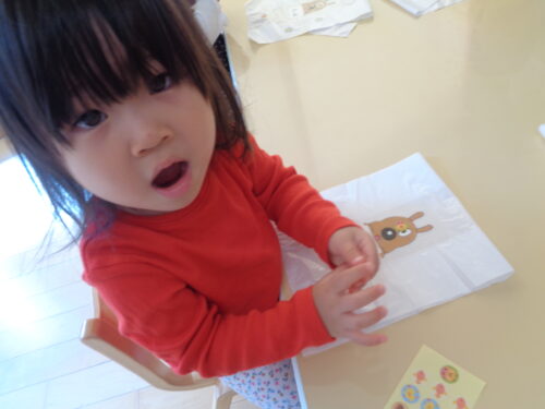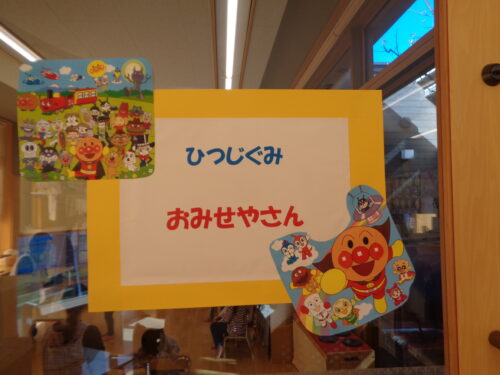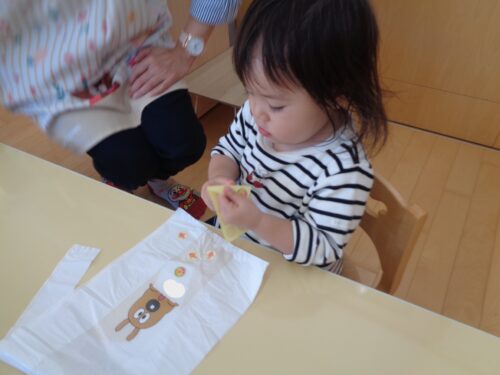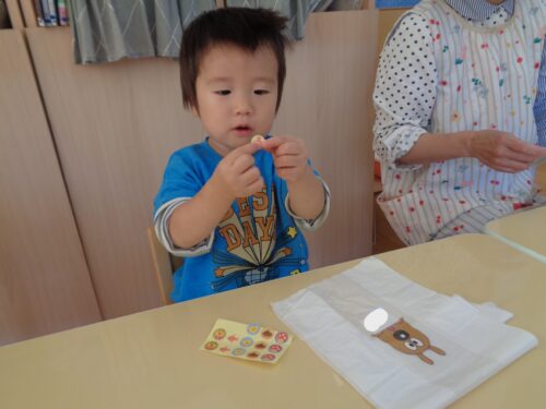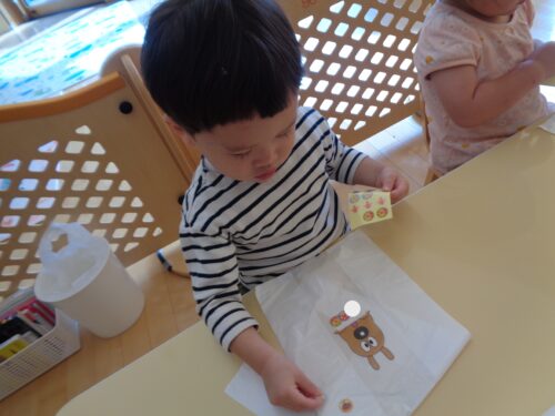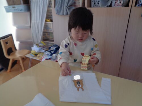 ひつじ組でお店屋さんごっこをした日の様子です。お買い物をする前にみんなでお買い物袋にシールを貼って飾りつけしましたよ!