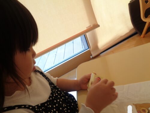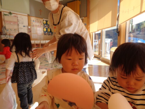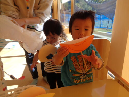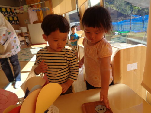 お店屋さん開店です☆ぺろぺろキャンディーとアンパンマンのメダルを買いました♪100円を握りしめ、お買い物ができると嬉しそうでした😊ほし組さんから糸電話もプレゼントしてもらいましたよ。