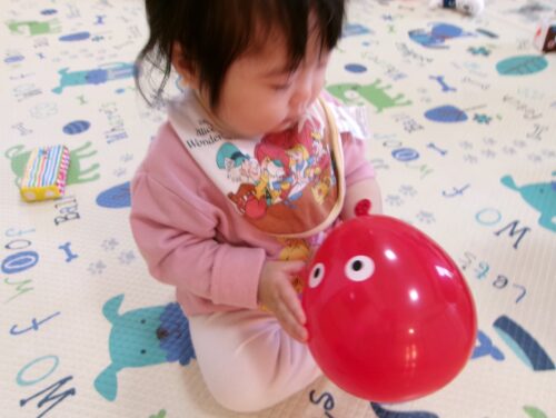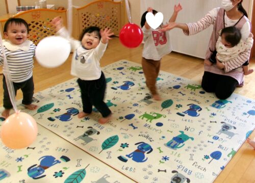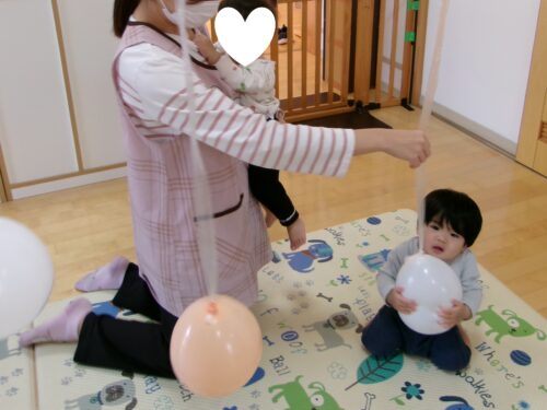 室内ではスズランテープに風船を結んでカーテンのようにして遊びました☆風船が大好きで大喜びでしたよ♪