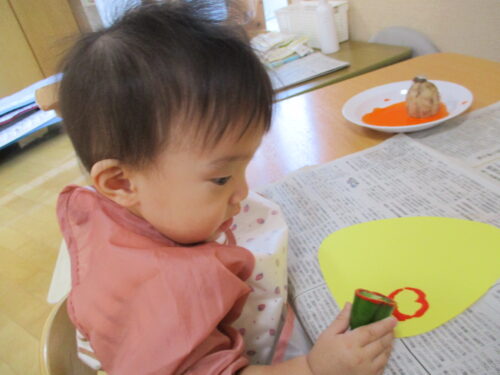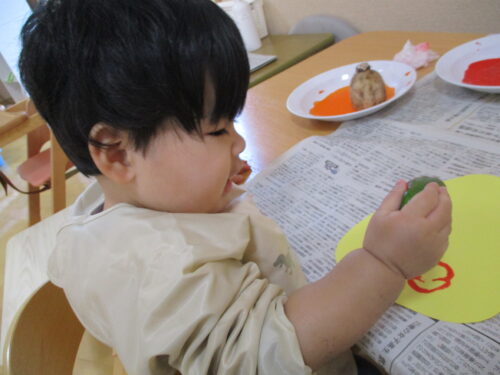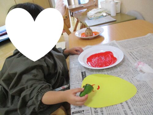 レンコンとピーマンの野菜でスタンプをし、『秋の木』を作りました!
