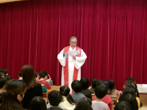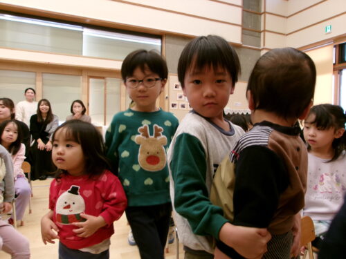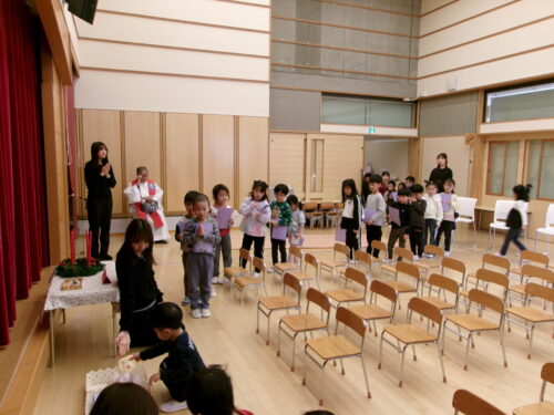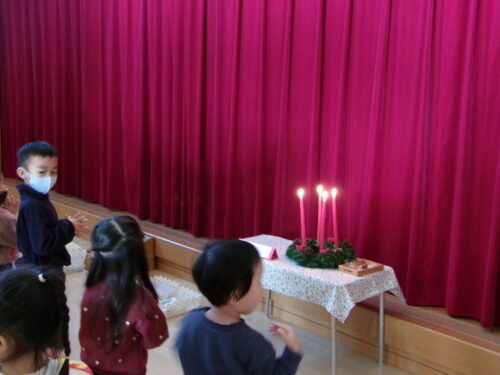 にじ、そら、つき組がアドベントカレンダーと献金をイエス様にお捧げしました。