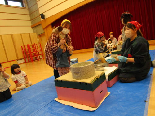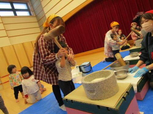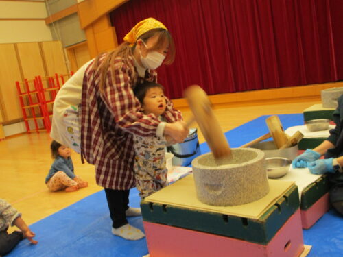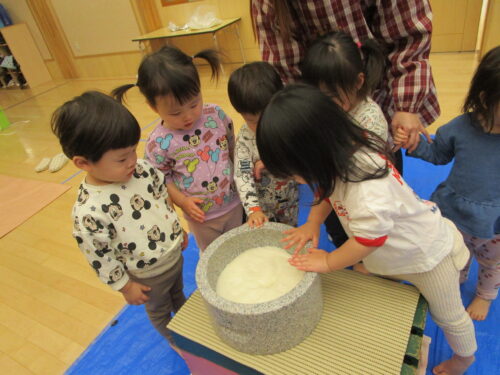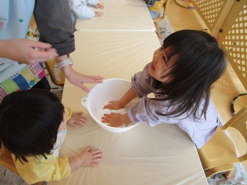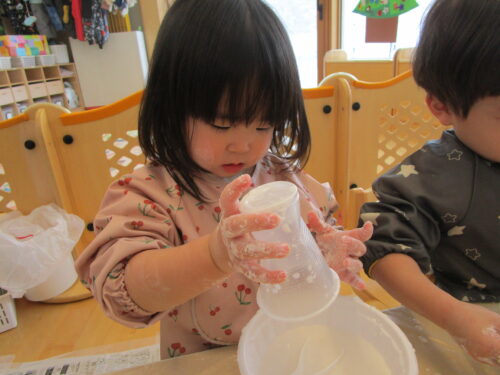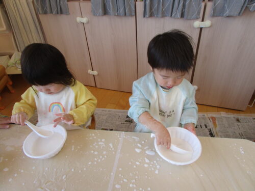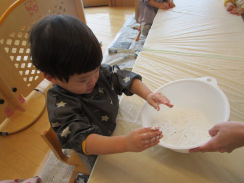 片栗粉の感触遊びも楽しかったですよ♡みんな夢中になって・・・気づいたら真っ白になっていました。