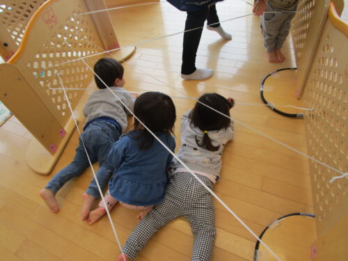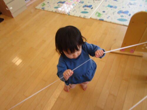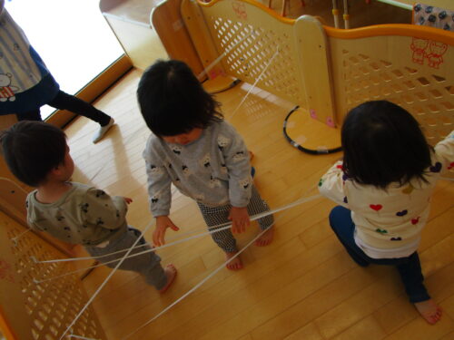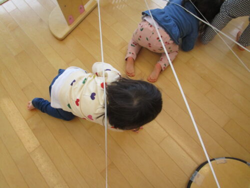 お部屋に張り巡らされたゴム紐をまたいだり、くぐり抜けてみたり。