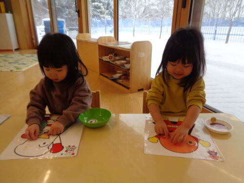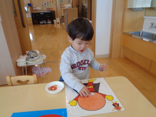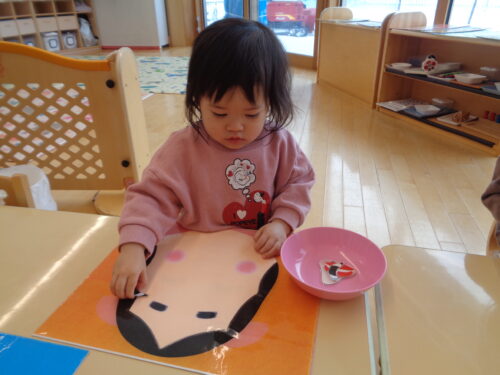 「福笑い」をした時の様子です。目や口の位置を考えて置き、出来上がった顔を見て嬉しそうにしていましたよ!