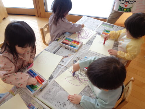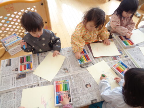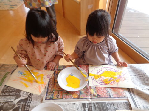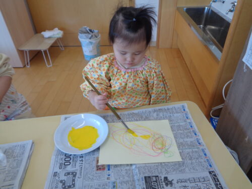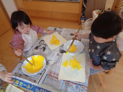 自分で筆を持ち、色をのせるのがとても嬉しかったようで夢中になって塗っています♪「鬼のお面」の完成が楽しみですね😊