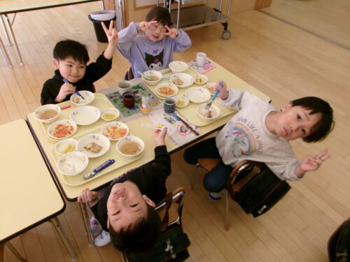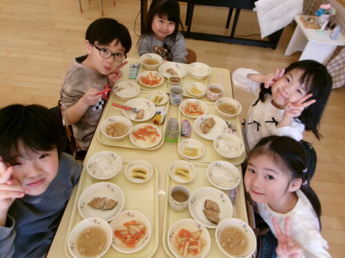 実は先日年中さんで給食を食べましたよ♪大盛り上がりでした!