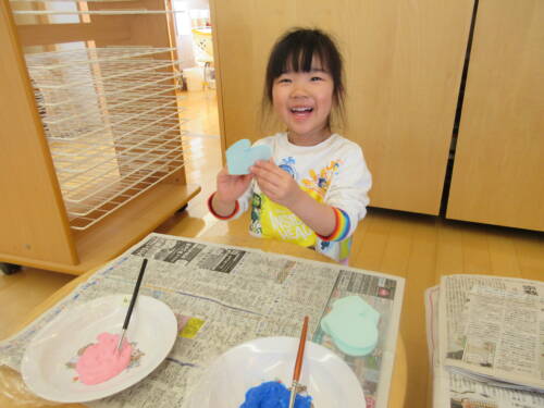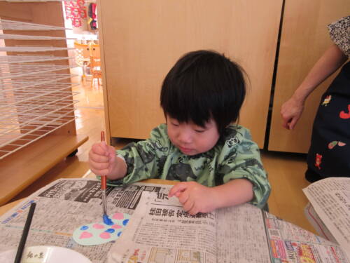 そんな大好きな年長さんに、優しくしてくれてありがとうの気持ちを込めて、卒園おめでとう壁面製作を作りました。色画用紙の片側だけに絵具で模様をつけて、パタン!と閉じてしっかり手でアイロン。そーっと開くと・・・?デカルコマニーという初めての手法にも、きれいな模様の蝶々が出来た事にも大喜びのほしさんでした。