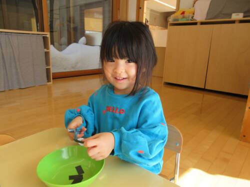 ほし組では先生が蝋燭に火を点けますが幼児クラスではお当番さんが点けている事にびっくりしていました。お昼寝も1月から幼児クラスと一緒にホールで寝ていますが、3月からは午睡後の午後おやつも幼児クラスで一緒に食べます。いつもお兄さんお姉さんが優しく教えてくれたりお世話してくれるので嬉しく、進級を楽しみにしているほし組さんです。
