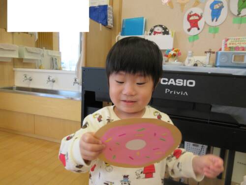 進級おめでとうカードはぴんくのイチゴのドーナツでした。年少さんは【ぴんくさん】と呼ばれます。