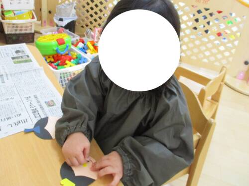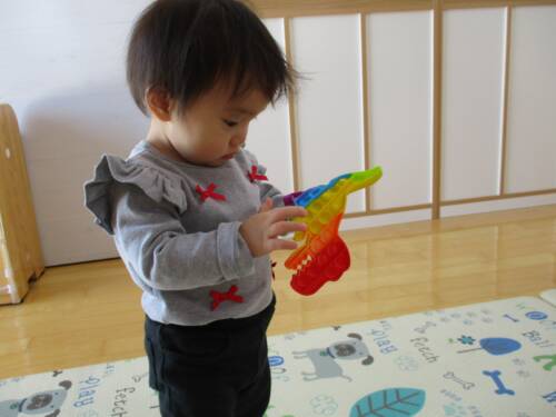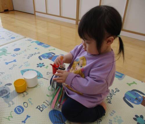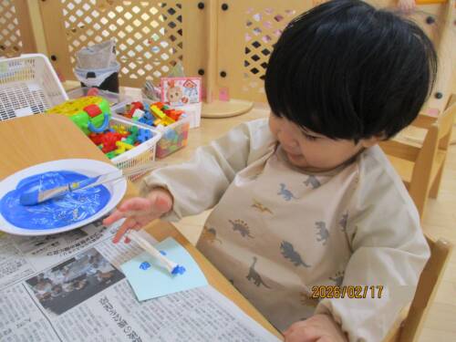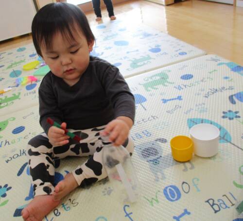 やりたい気持ちに溢れているほし組さん。今は幼児クラスへの移行活動として個人持ちの食具やコップを使用しています。上靴を履いて幼児さんと一緒にお集りに参加したりと期待に胸を膨らませて毎日を過ごしています。進級が楽しみですね!