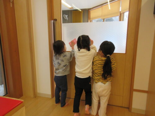 ある日のお部屋の風景です。可愛いお掃除隊がドアのガラスを拭いてくれています。