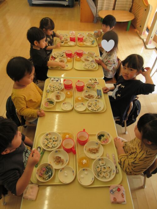 その後はほっと一息ついて、歳の数だけ「あさひ豆」を3粒、給食と共にいただきました。